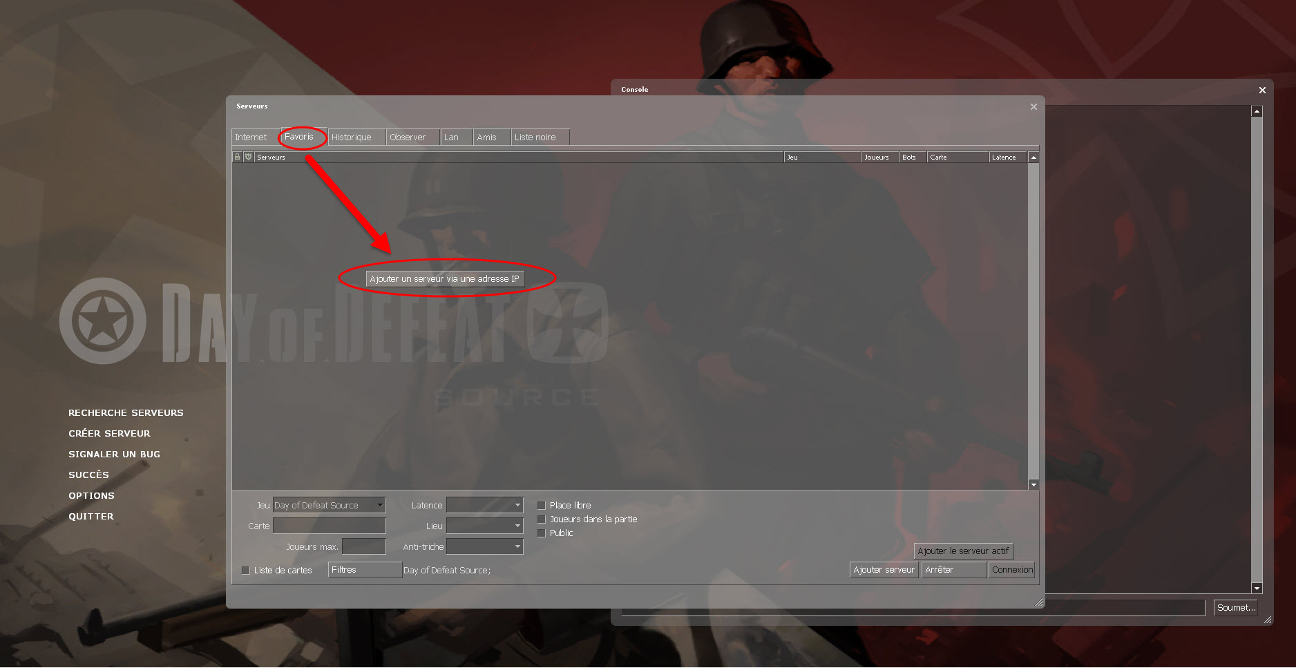 Vous pouvez également l'ajouter manuellement ou le rentrer dans vos favoris pour une connexion ultérieure. Pour cela, rendez-vous dans l'onglet Favoris puis faîtes un clic droit dans l'encart de la fenêtre de connexion. Un menu vous propose alors d'ajouter un serveur par son adresse IP. Vous pouvez également directement cliquer en bas de la fenêtre sur Ajouter un serveur.