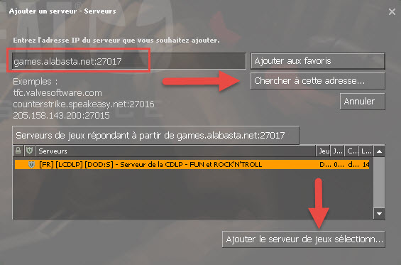 Dans la fenêtre de saisie qui apparaît, entrez alors l'adresse du serveur d'Alabasta disponible dans la rubrique Informations de connexion puis cliquez sur Rechercher des jeux à cette adresse.