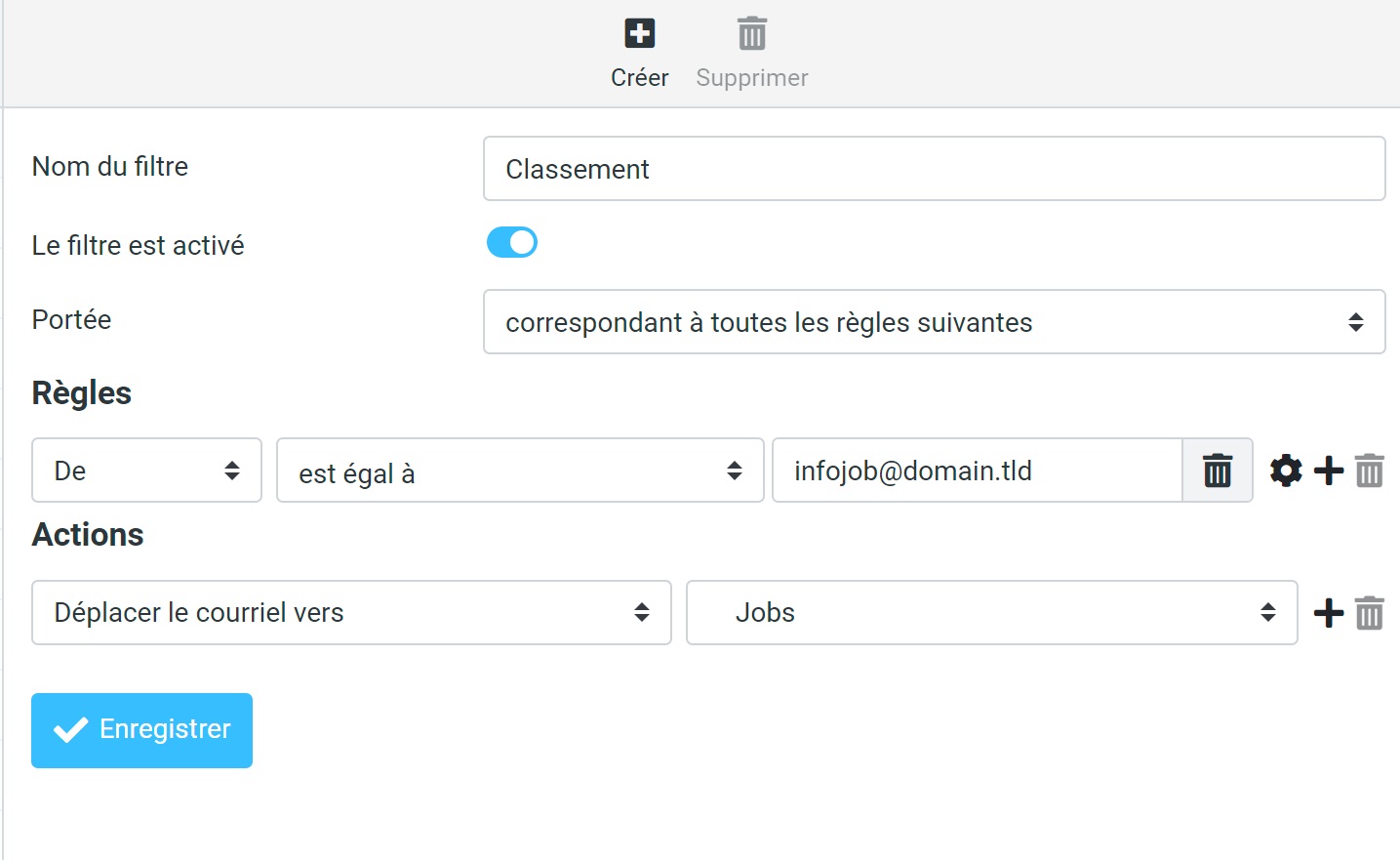 Voici un par exemple de filtre permettant le classement automatique d'un mail dans un sous-dossier selon l'expéditeur :